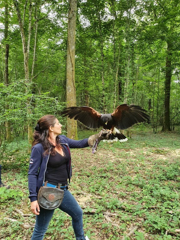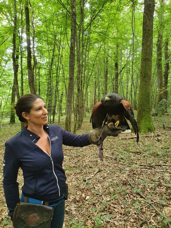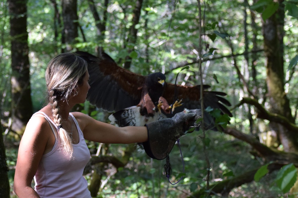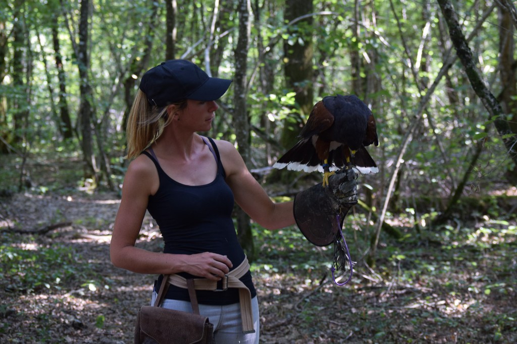 Les stages incluent également des balades en forêt, des techniques de port des rapaces et l’apprentissage de l’affaitage pour le bas vol et haut vol,